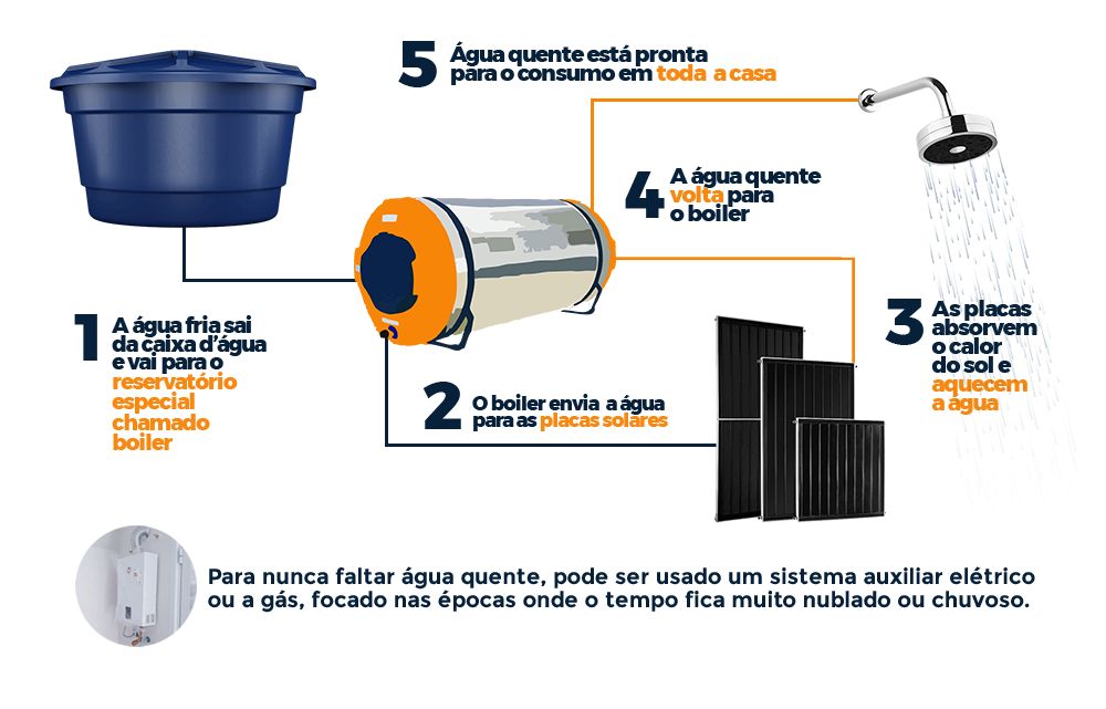 As placas de aquecimento solar, instaladas estrategicamente no telhado. Elas absorvem a radiação solar e transformam em calor, transferindo-o para água que circula pelas placas e, por sua vez, aquecem a água armazenada no boiler.